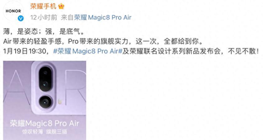 这款新机就是——荣耀 Magic8 Pro Air,将于 1 月 19 日正式发布。