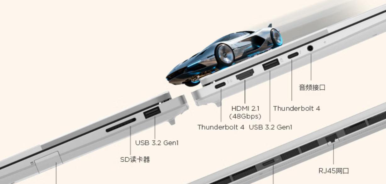 接口方面:TGX显卡扩展坞接口、SD读卡器、双USB-A3.2 Gen1、双雷电4/USB4、HDMI 2.1、千兆网口——该有的一个没少。